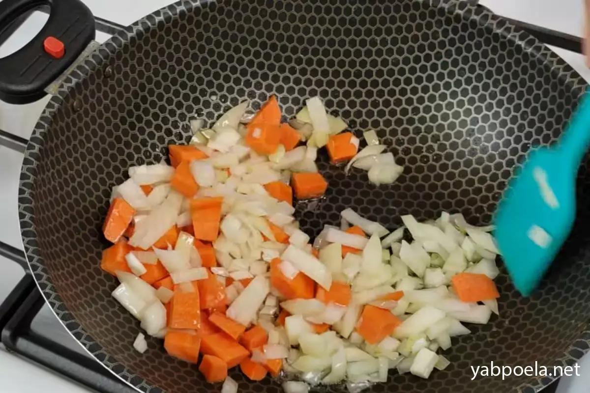 У казані або глибокій сковороді розігрійте 5 ст. л. олії. Відправте туди цибулю та моркву. Обсмажуйте, помішуючи, до легкої золотавості.
