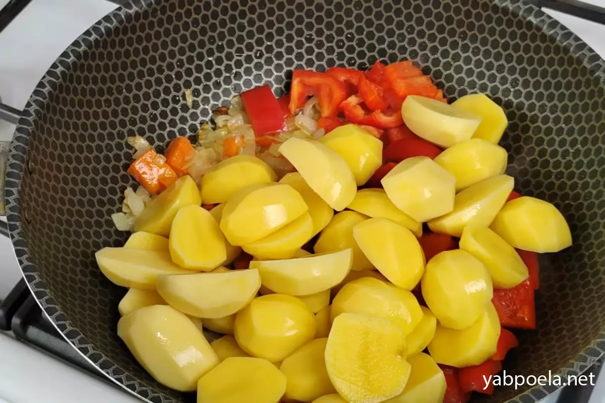Як тільки цибуля зазолотилася, додайте болгарський перець і відразу ж картоплю. Перемішайте і дайте овочам обсмажитись разом 5–7 хвилин.
