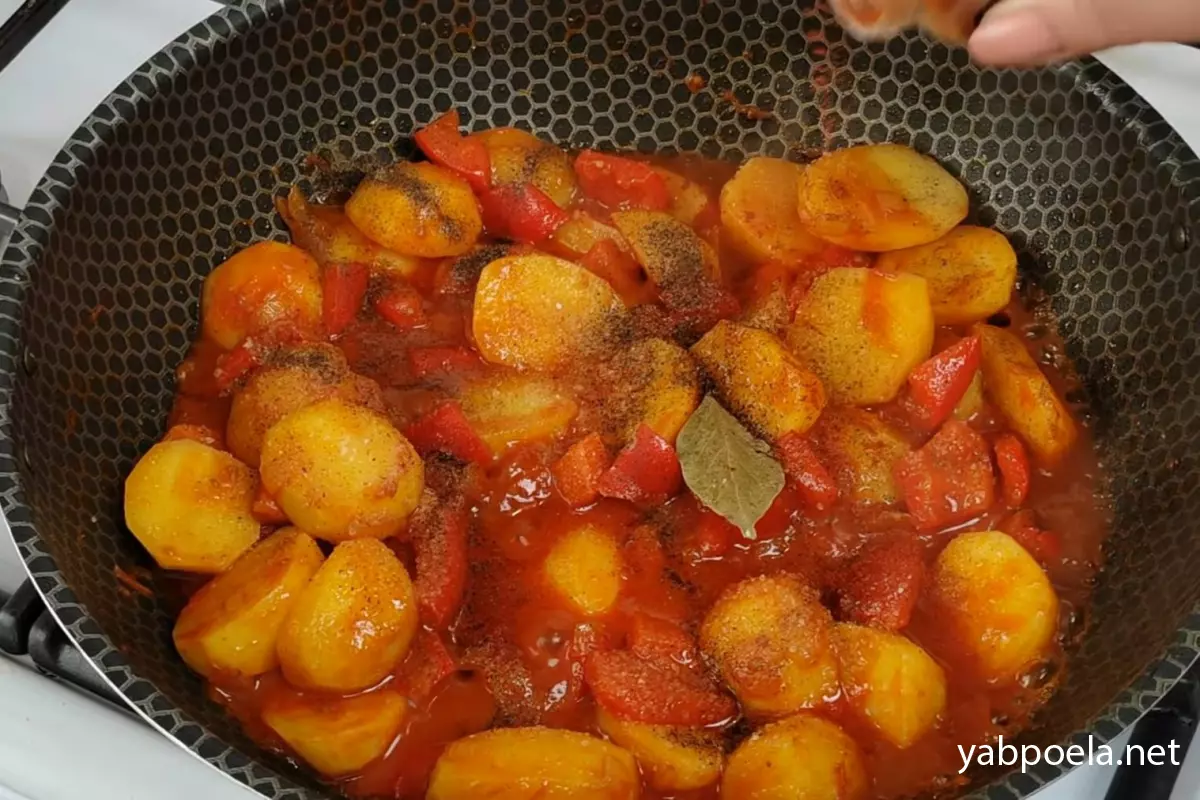 Через 20 хвилин перевірте картоплю. Якщо вона готова, обов'язково скуштуйте соус. Якщо кислувато (через томат), додайте 1 ч. л. цукру для балансу. Видаліть лавровий лист.