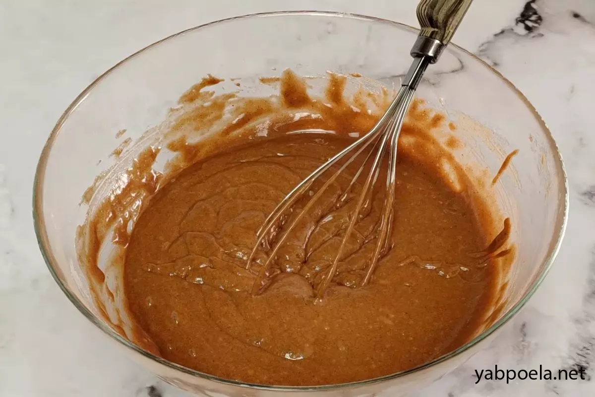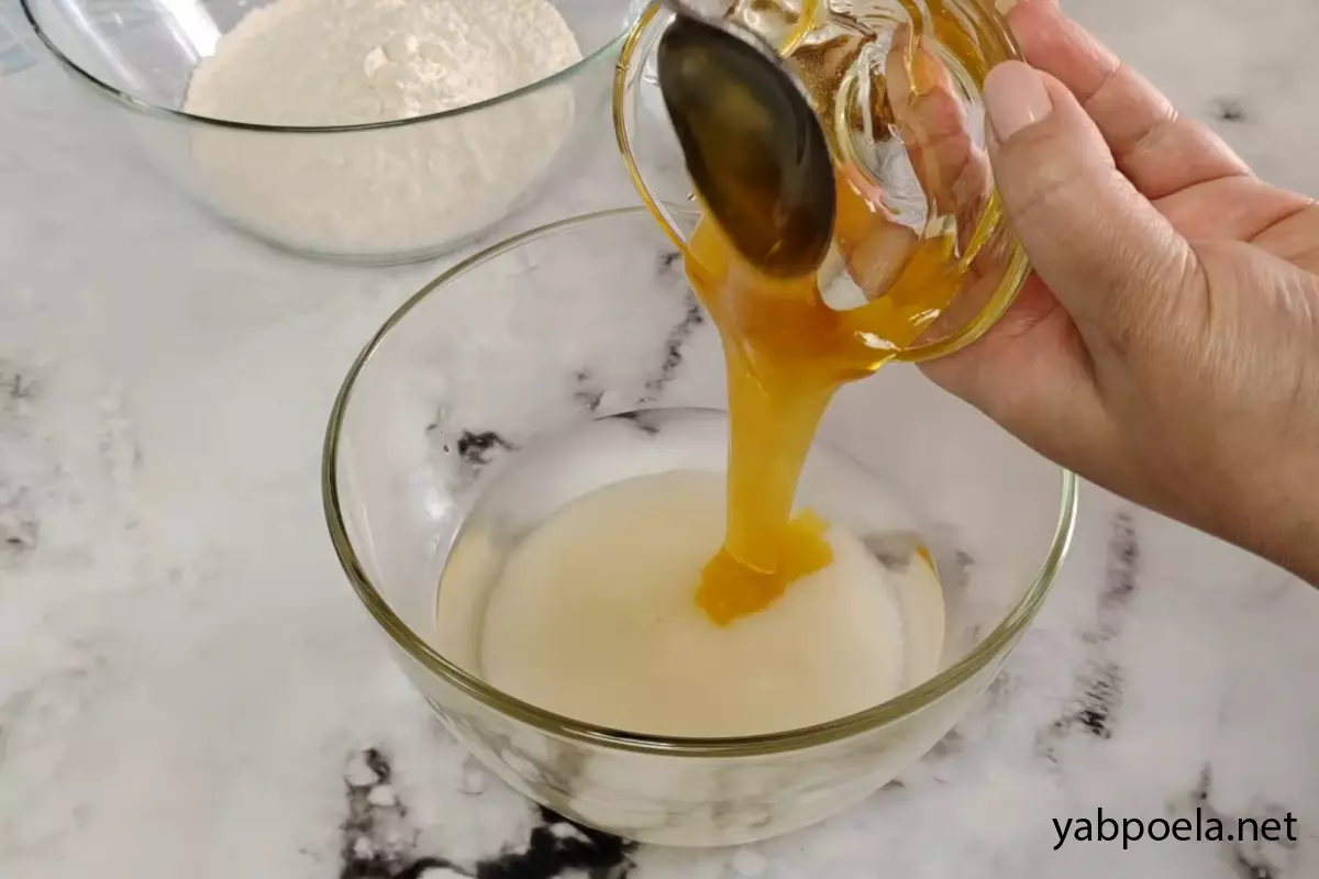 Влийте солодку медову воду в сухі інгредієнти. Почніть замішувати тісто. Воно має вийти гладким, без грудочок, за консистенцією — як густа сметана (не надто рідке, але й не густе).