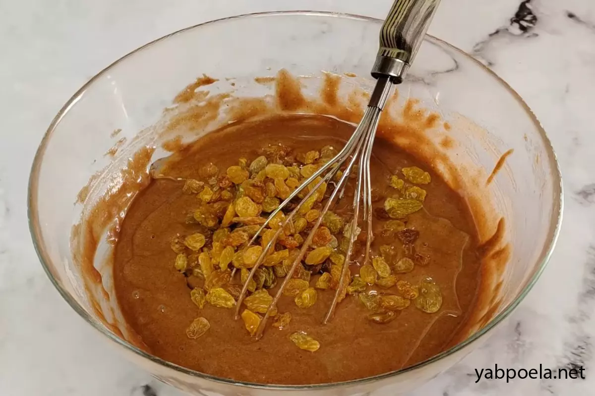 Додайте в тісто 50 г рослинної олії та промиті, обсушені родзинки. Ще раз добре перемішайте до поєднання інгредієнтів.