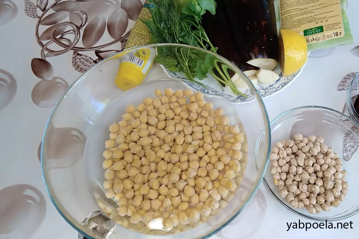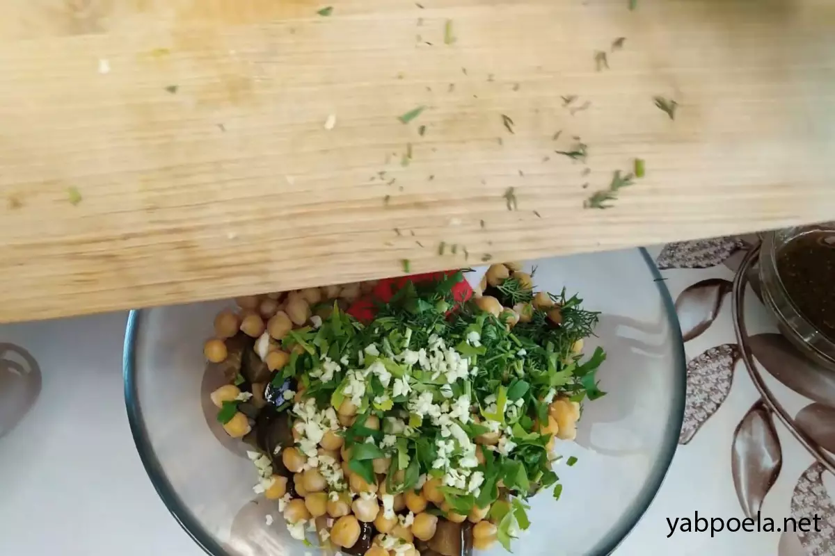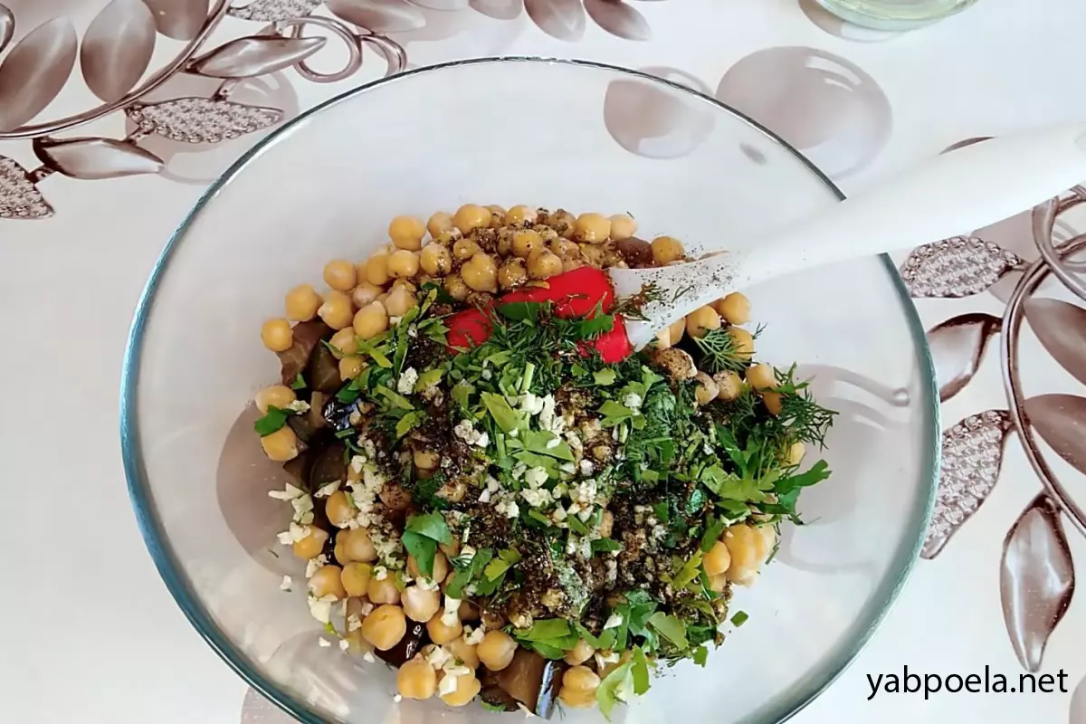 Готовий гарячий нут (зливши з нього воду) з’єднайте в салатниці з тушкованими баклажанами.