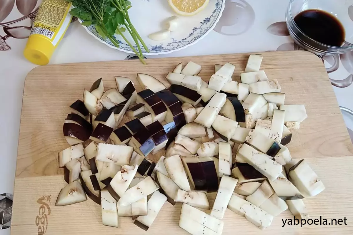 Баклажан наріжте кубиками. Якщо сорт гірчить — замочіть кубики в підсоленій воді на 20 хвилин, потім злийте рідину.