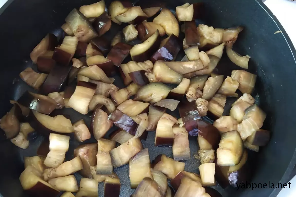 Важливо: Наприкінці, коли баклажани стануть м’якими, дайте залишкам води повністю випаруватися (2–3 хвилини), щоб шматочки трохи підсушилися.