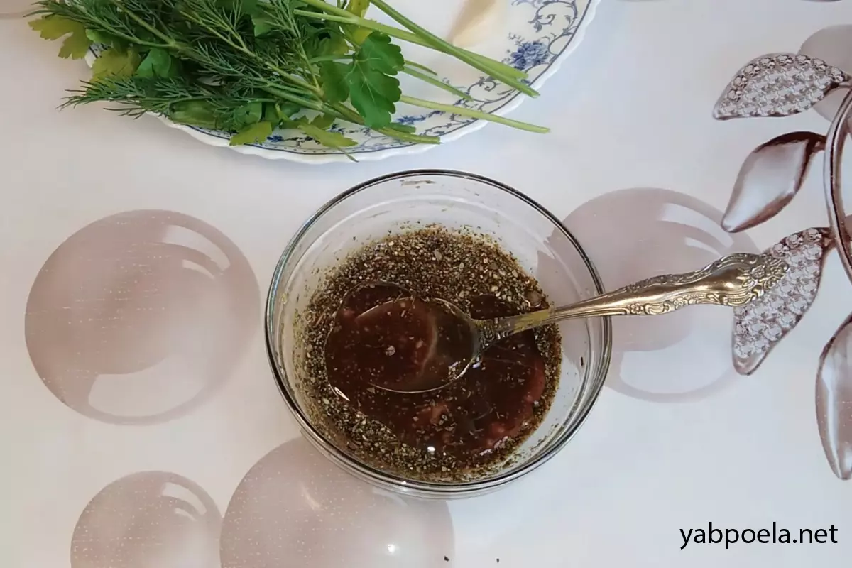 У мисці змішайте 1 ст. л. соєвого соусу, 0.5 ч. л. гірчиці, 1 ст. л. лимонного соку і 1 ст. л. рослинної олії (за бажанням). Додайте сушений базилік і хмелі-сунелі. Перемішайте.