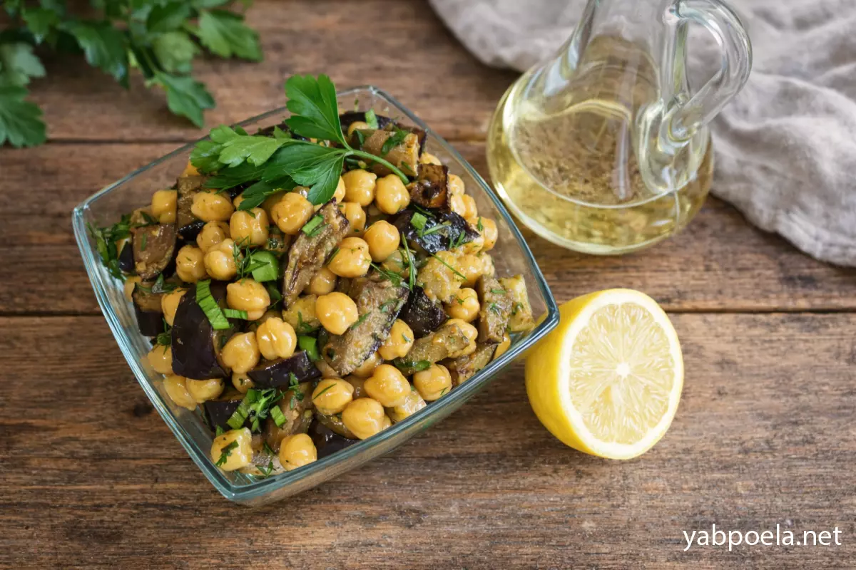 Цей рецепт — справжня знахідка для тих, хто шукає ситні та корисні страви без м’яса. Нут (турецький горох) — чудове джерело рослинного білка, а в поєднанні з баклажанами та пікантною заправкою він перетворюється на повноцінну страву. Салат виходить пряним, ароматним і дуже насиченим.