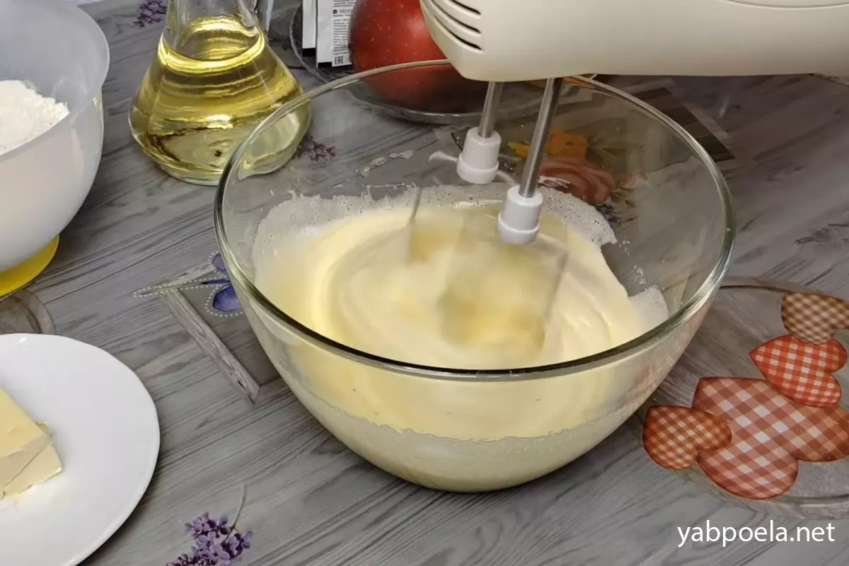 У глибоку миску розбийте яйця. Додайте 120 г цукру та щіпку солі для балансу смаку. Збивайте міксером або вінчиком близько 1 хвилини, поки маса не посвітлішає, стане легкою та повітряною (стійка піна тут не потрібна).