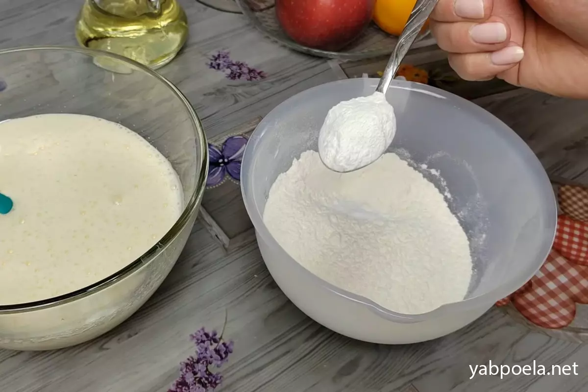 В окремій ємності з’єднайте сухі інгредієнти: 150 г борошна, 1 г ваніліну та 1 ч. л. розпушувача. Перемішайте.