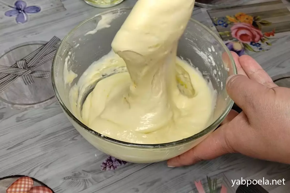 Частинами вводьте суху суміш у яєчно-сметанну масу. Акуратно вимішуйте тісто лопаткою рухами знизу вгору, щоб не втратити повітряність. За бажанням додайте 0,5 ч. л. цитрусової цедри для аромату.