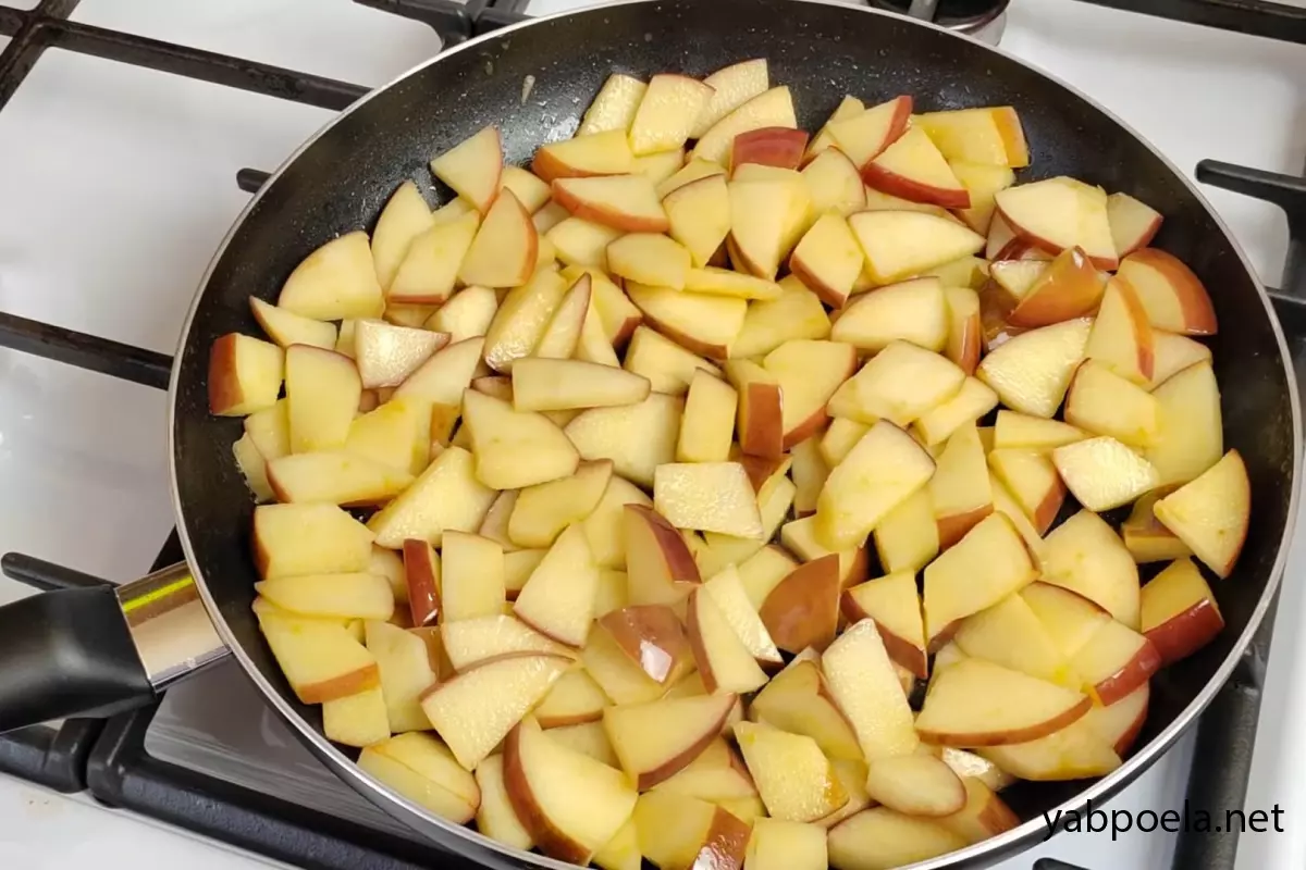 Викладіть яблука у сковороду. Обсмажуйте їх буквально 2–3 хвилини, щоб вони просочилися вершковим маслом і стали злегка прозорими. Розподіліть яблука рівним шаром по всьому дну.