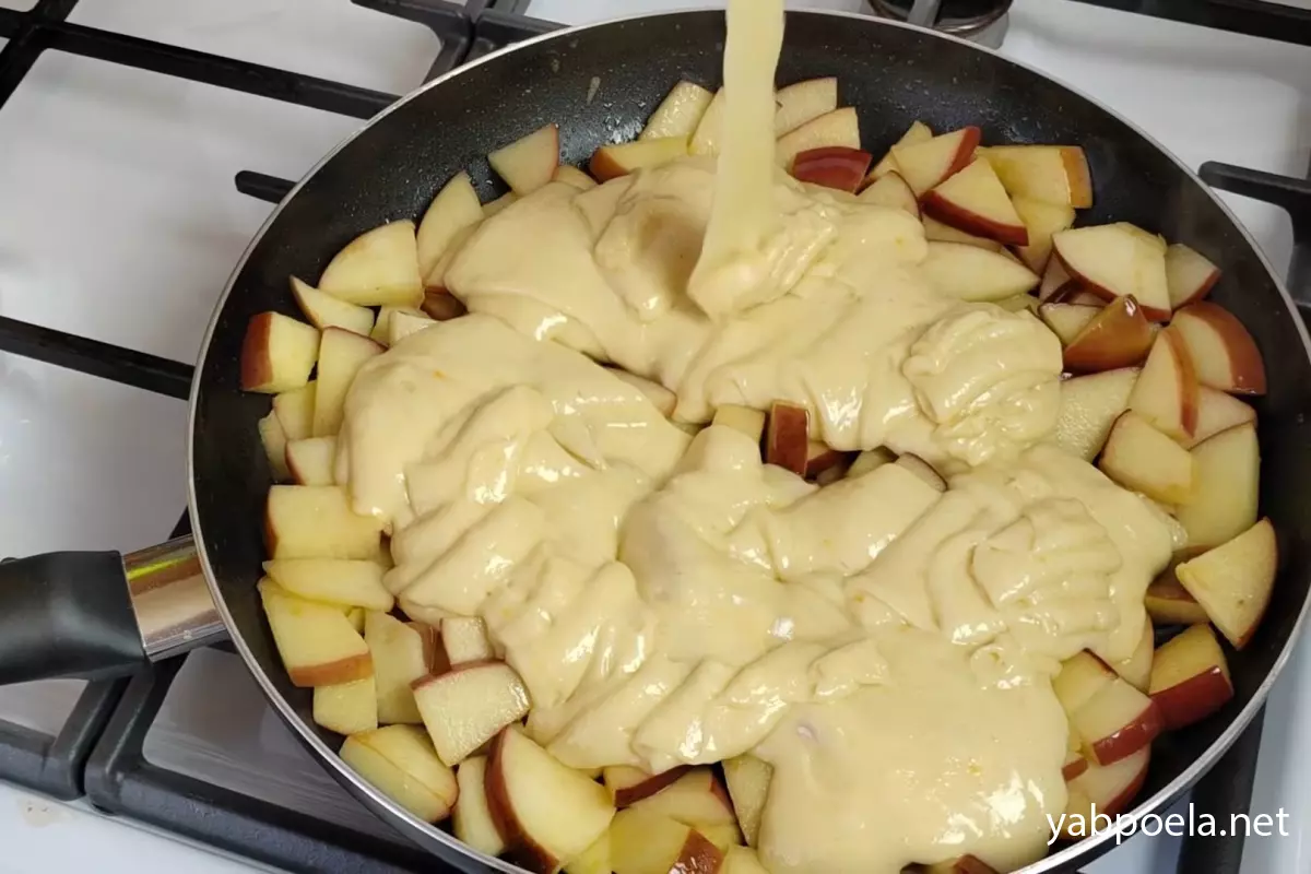 Зменште нагрів до рівня нижче середнього. Рівномірно вилийте повітряне тісто поверх яблук, акуратно розрівнюючи його лопаткою.
