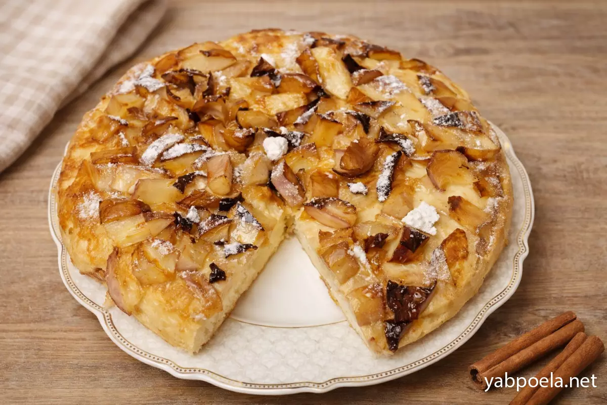 Перевертаємо пиріг: Візьміть плоску тарілку, злегка змастіть її соняшниковою олією та накрийте нею пиріг прямо в сковороді. Швидко переверніть сковороду, щоб пиріг опинився на тарілці (яблуками догори).