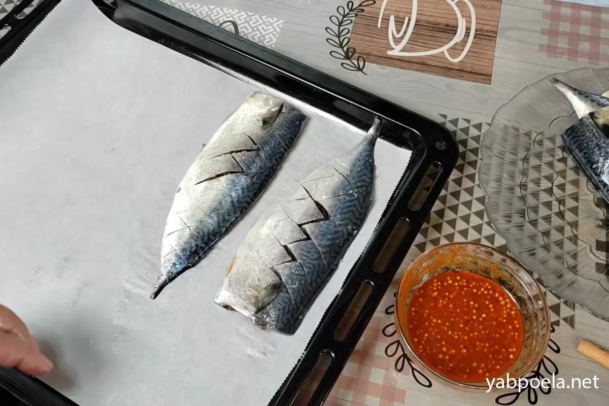 Перекладіть підготовлене філе скумбрії на деко, застелене пергаментом. Посоліть рибу за своїм смаком (сіль можна також одразу додати в маринад).