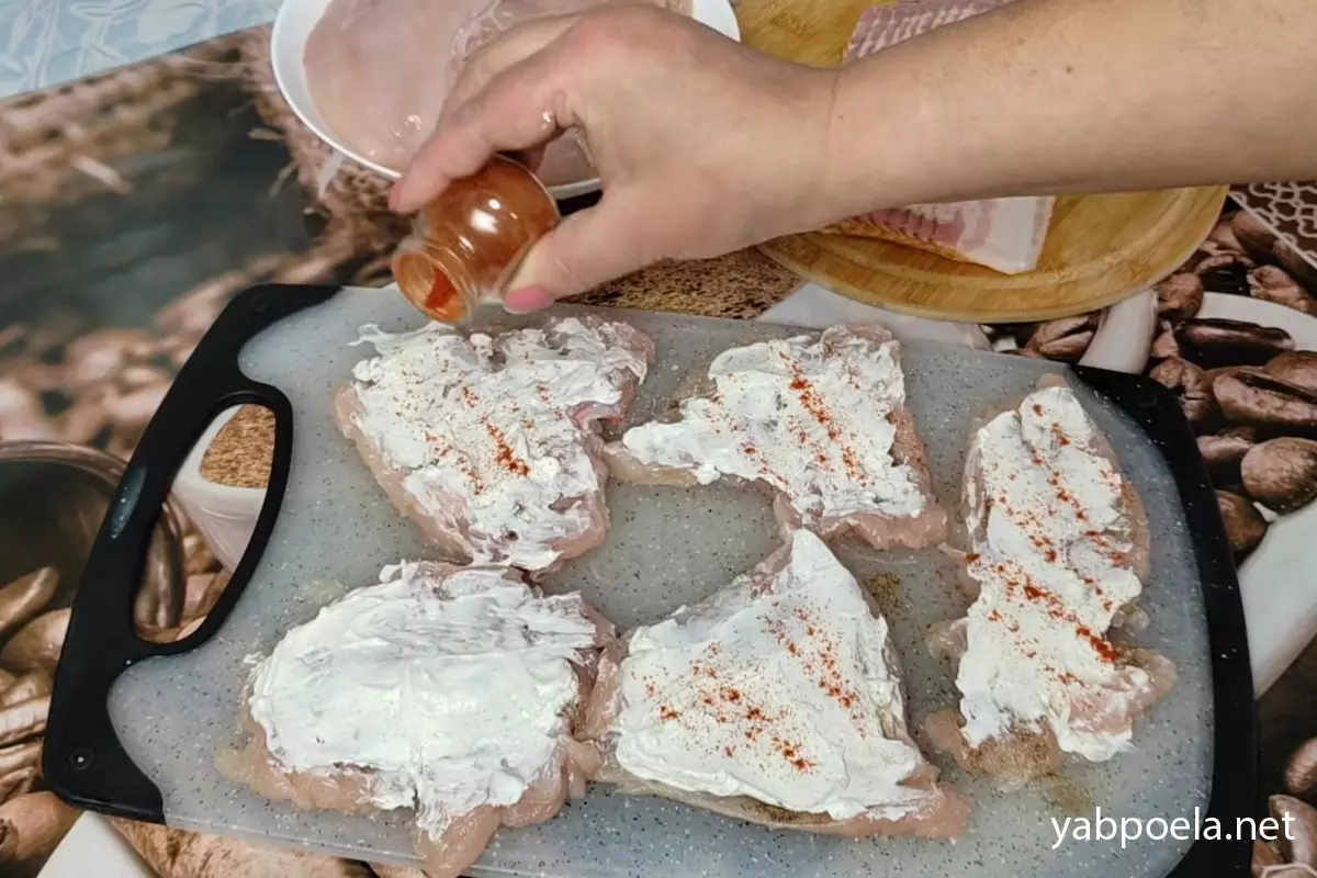 Злегка посоліть і поперчіть відбиті шматочки з обох боків. Додайте сушений часник.