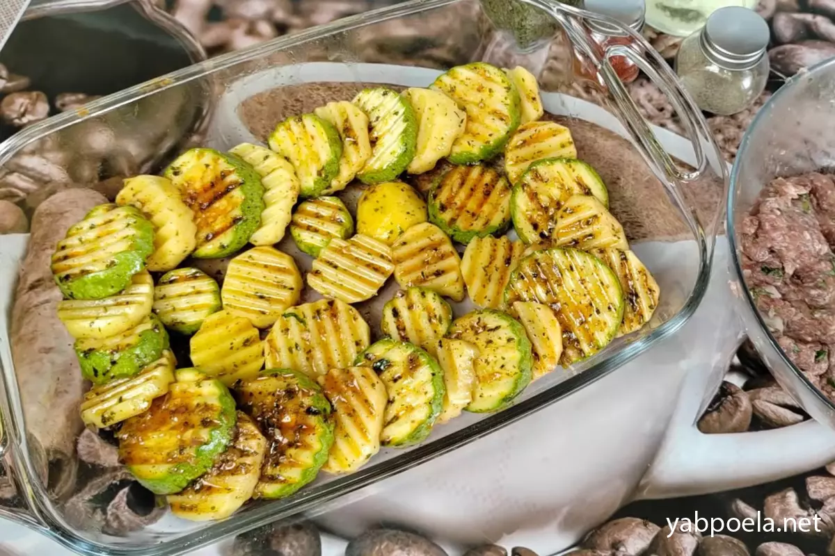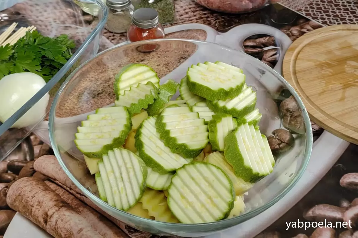 Візьміть відповідну форму для запікання (змащувати її олією не потрібно, адже олія вже є в овочах). Викладіть замариновані кружальця картоплі та кабачка на дно форми, чергуючи їх між собою або у довільному порядку.