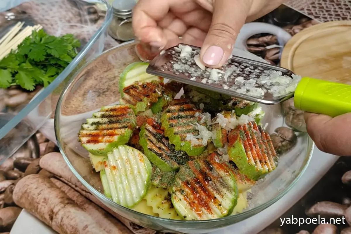 Одразу додайте до овочів спеції, щоб картопля не потемніла: 1 ч. л. паприки, чорний і гострий перець, кавказькі трави та сіль за смаком. Видавіть 2 зубчики часнику й влийте 2 ст. л. соняшникової олії. Ретельно все перемішайте руками, щоб кожен кружалець покрився ароматною олією. Відставте миску вбік.