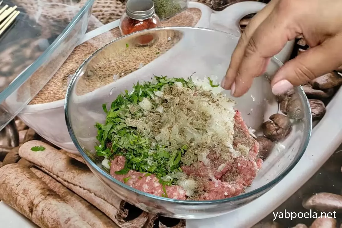 У глибокій мисці з’єднайте змішаний фарш, натерту цибулю та зелень. Додайте сіль і чорний перець. Обов’язково додайте 0.5 ч. л. зіри, попередньо злегка розтерши її в долонях, щоб спеція максимально розкрила свій чудовий аромат.
