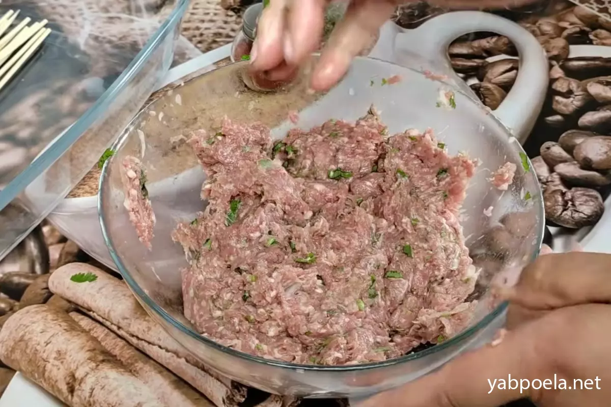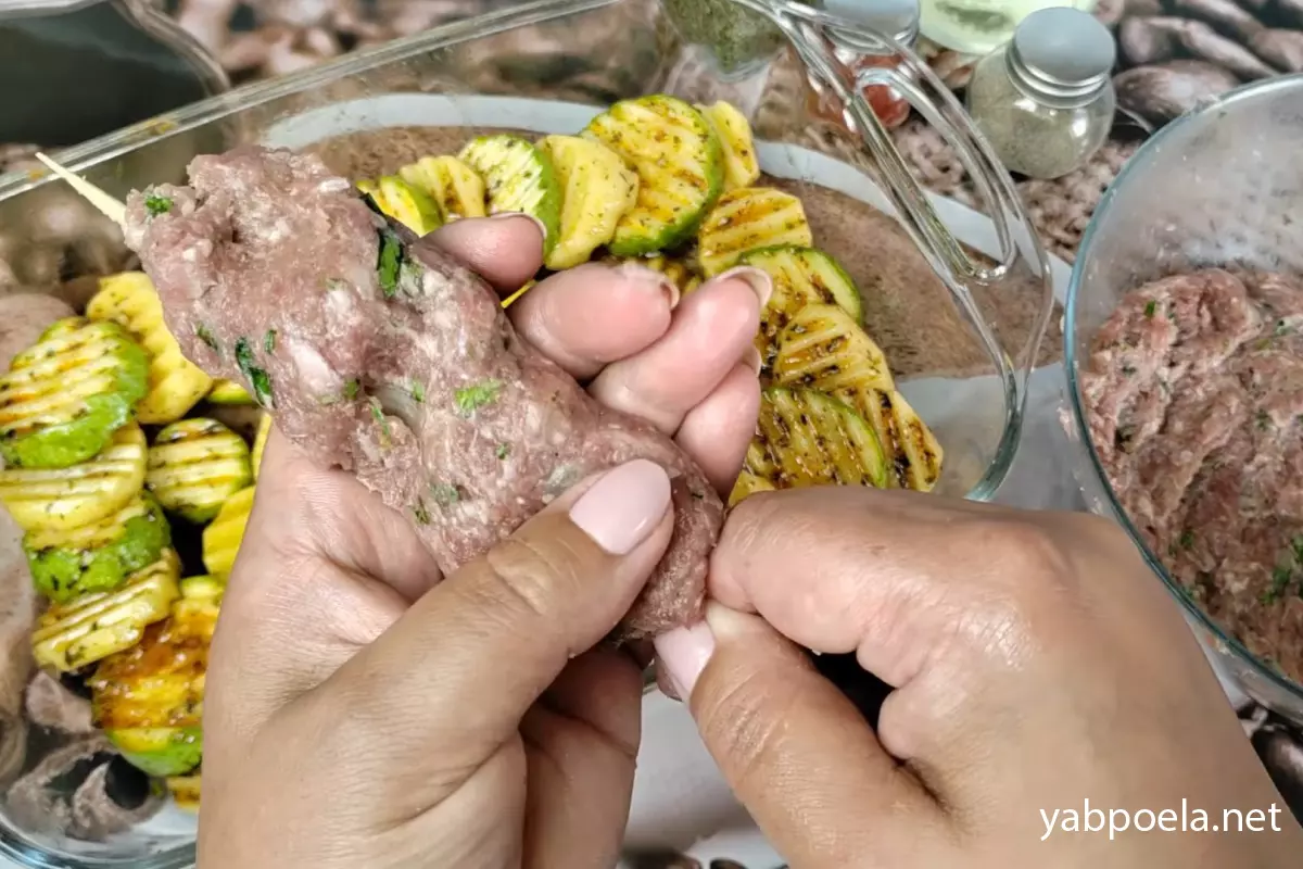 Розділіть відбитий фарш на порційні кульки вагою приблизно по 70 грамів. Візьміть одну кульку, ще раз добре відбийте її в руках, проткніть дерев’яною шпажкою та розподіліть м’ясо вздовж неї. Обов’язково щільно запечатайте краї зверху й знизу.