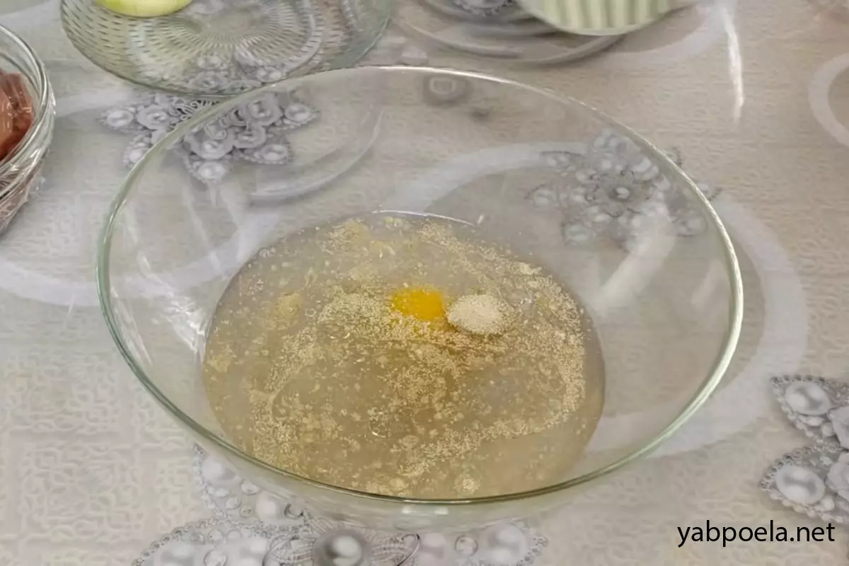 У глибокій мисці з’єднайте 370 мл злегка теплої води, 1.5 ч. л. солі, 2 неповні ст. л. цукру, 1 яйце і 5–6 ст. л. соняшникової олії. Всипте 11 г швидкодіючих дріжджів. Злегка перемішайте і залиште на кілька хвилин, щоб дріжджі активувалися.