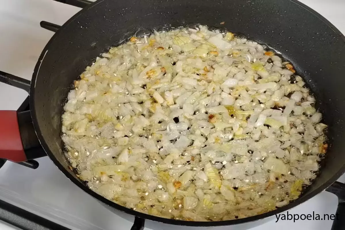 Поки підходить тісто, займіться начинкою. Велику цибулину наріжте дрібним кубиком. Розігрійте сковороду з 3–4 ст. л. соняшникової олії та обсмажте цибулю до красивого золотистого кольору.