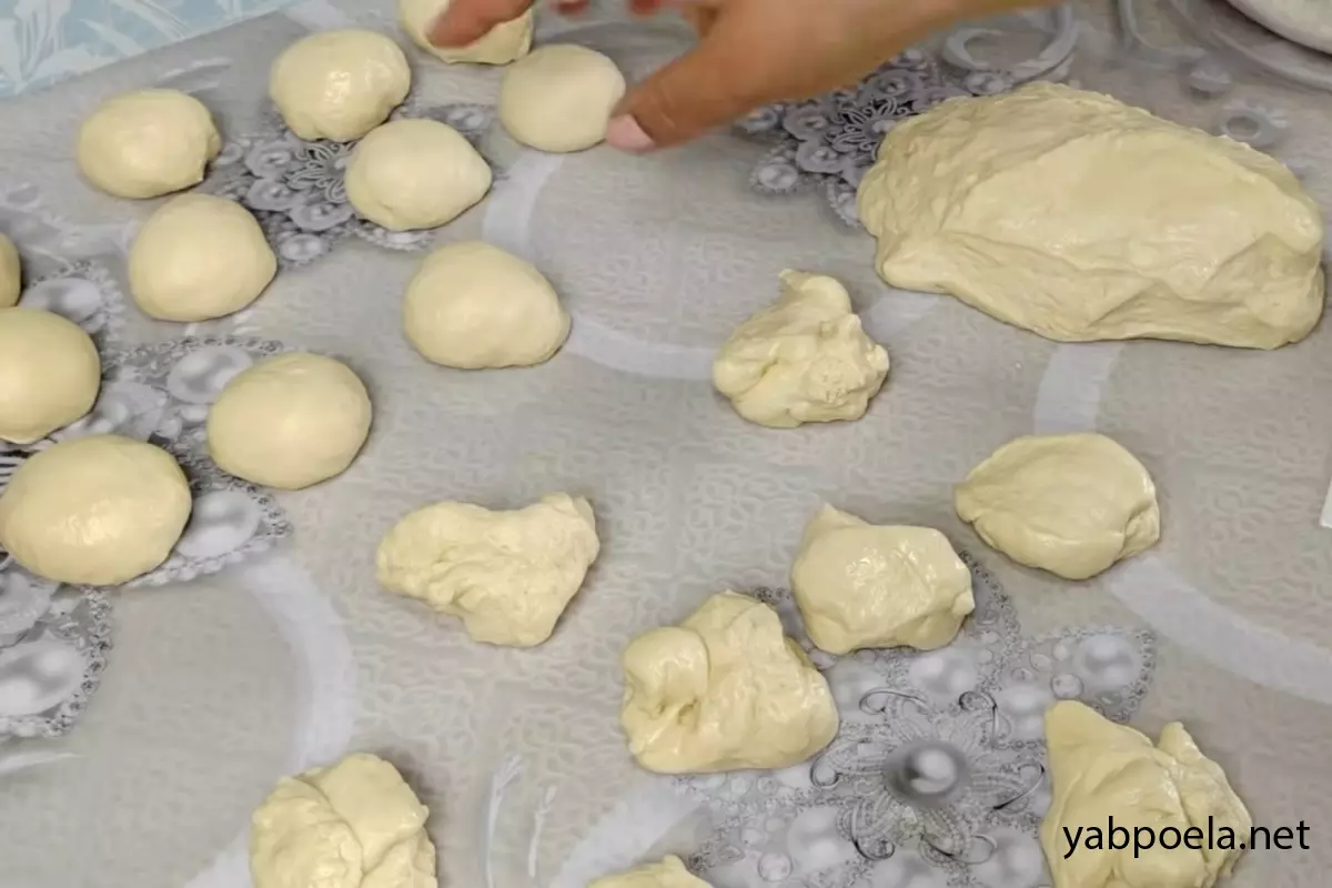 Розділіть тісто на невеликі шматочки. Оптимальна вага для акуратних середніх пиріжків — приблизно по 40 грамів. Скачайте зі шматочків рівні кульки.