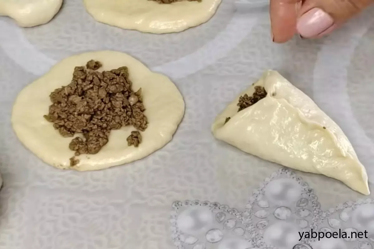 Візьміть кульку тіста і просто розтягніть її руками (можна обійтися навіть без качалки) у тонкий корж. У центр щедро викладіть охолоджену печінкову начинку і щільно защипніть краї.