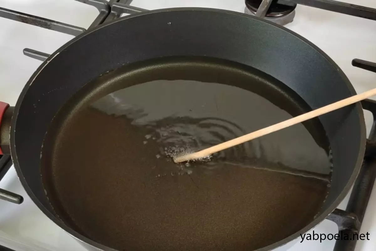 Перевірка температури: Опустіть в олію дерев’яну шпажку — якщо навколо неї активно з’являються бульбашки, можна смажити. Зменшіть вогонь до рівня «нижче середнього».