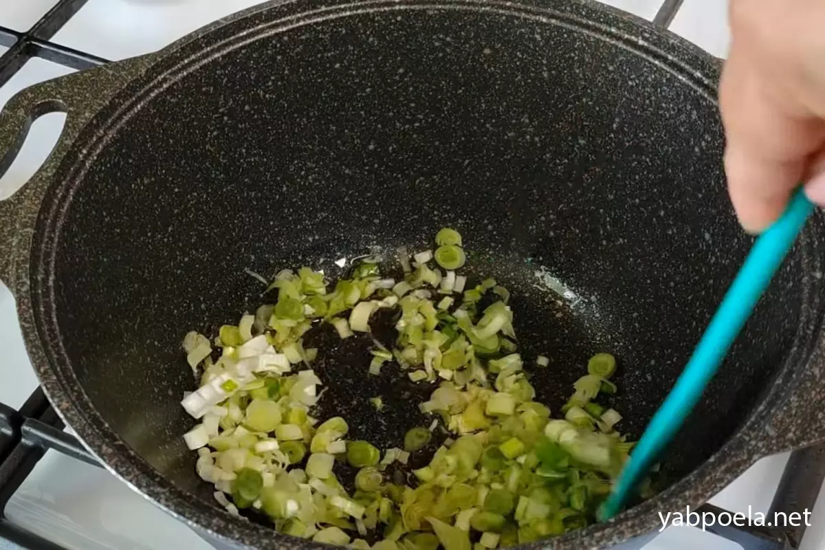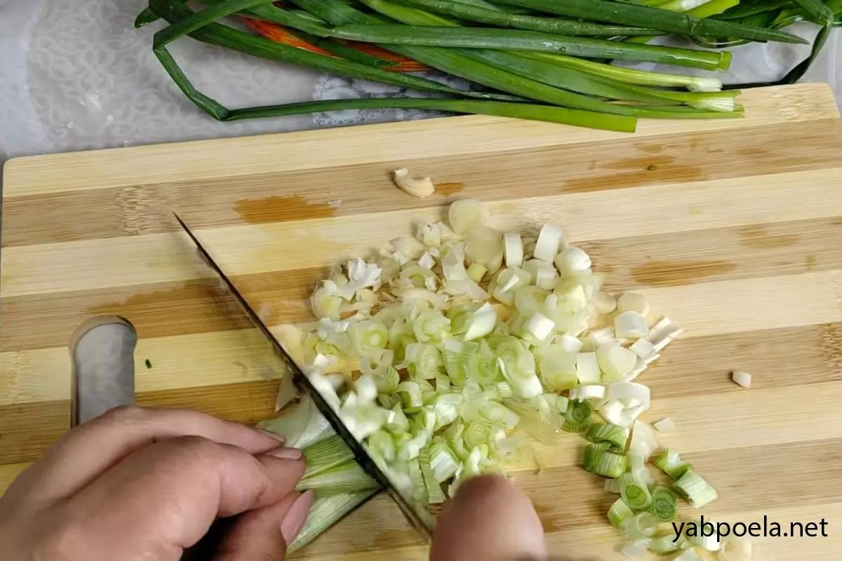 Відріжте щільну білу частину від зеленої цибулі (зелені пір’їнки залиште для подачі), розріжте її вздовж навпіл, а потім дрібно нашаткуйте. Якщо використовуєте звичайну салатну цибулю, також наріжте її дрібним кубиком.