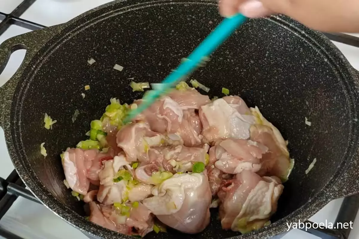Курячі стегна (з кісткою для навару) наріжте невеликими шматочками. Як тільки цибуля почне золотитися, відправте курку в каструлю. Смажте все разом до появи гарного золотистого кольору на м’ясі.