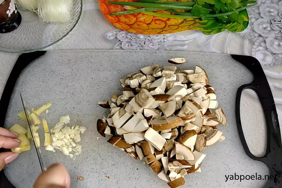 Поки смажиться курка, підготуйте інші інгредієнти. Печериці наріжте так, як вам більше подобається (крупно або дрібно). Шматочок імбиру (близько 2 см) і 2 зубчики часнику наріжте максимально дрібно.
