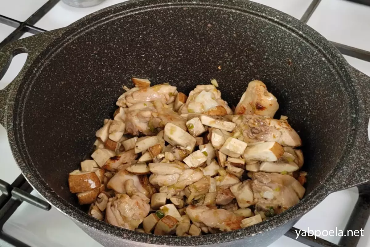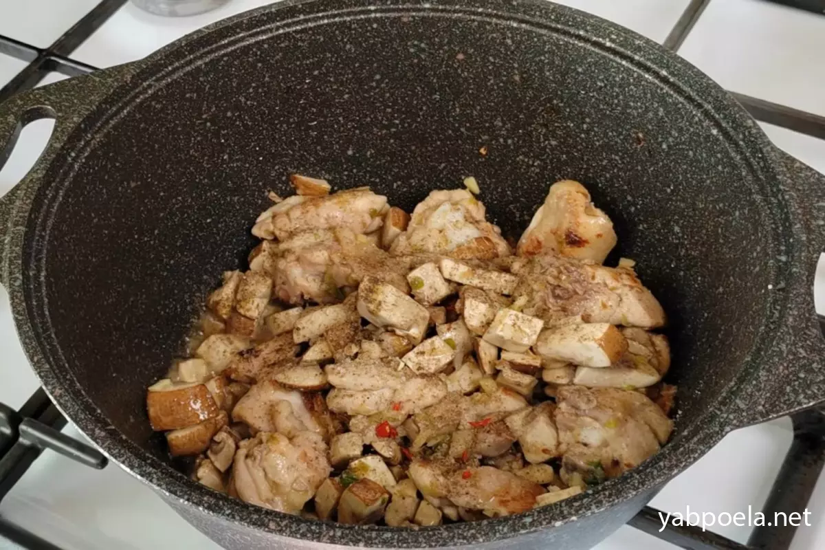 Коли курка обсмажиться до рум’яної скоринки, додайте до неї нарізані гриби, подрібнений часник та імбир.
