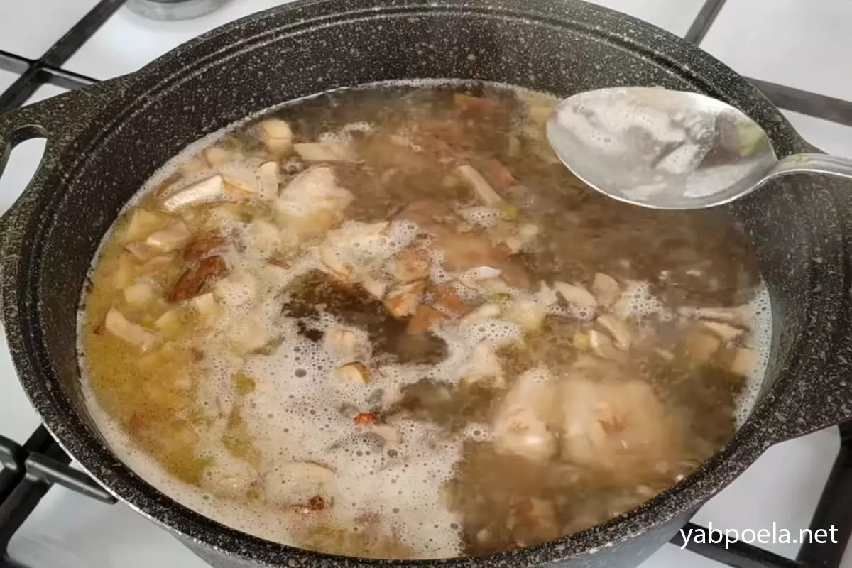 Зачекайте буквально хвилину, щоб гриби віддали свою рідину (засмажувати їх не потрібно). Одразу після цього влийте в каструлю воду (на 3-літрову каструлю потрібно приблизно 2 літри). Доведіть до кипіння, ретельно зніміть піну та варіть суп 15–20 хвилин до повної готовності курки.