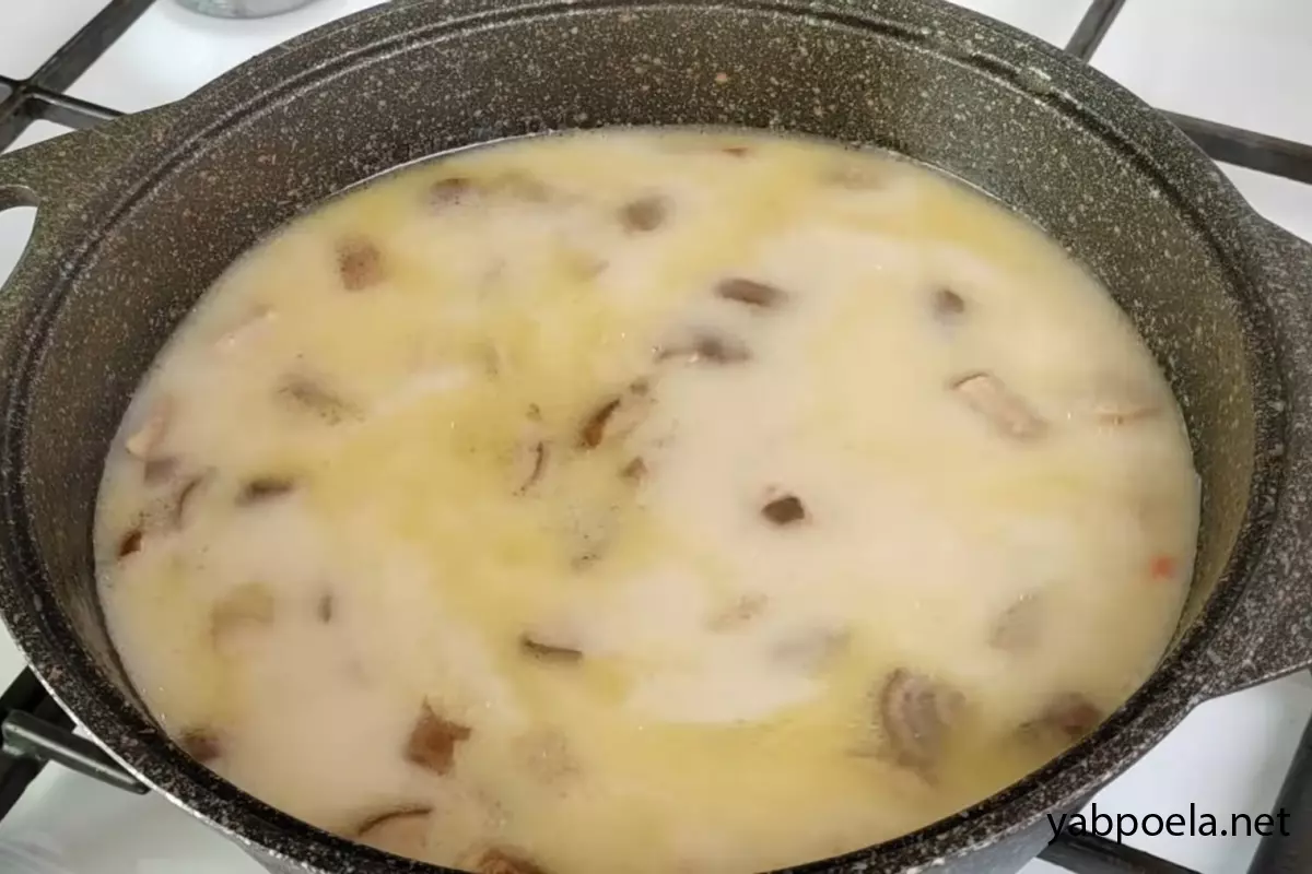 Коли курка звариться, обов’язково спробуйте бульйон на сіль. Потім влийте приблизно 100 мл нежирних вершків (10%). Дайте супу ще раз закипіти.