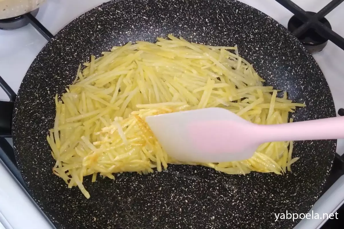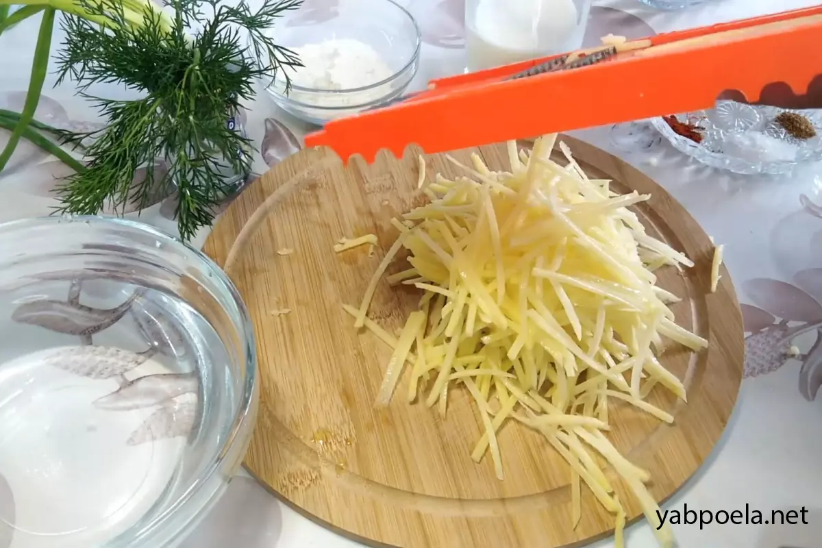 Очистіть 2 середні картоплини та натріть їх тонкою довгою соломкою на тертці для корейської моркви (або скористайтеся спеціальною овочерізкою).