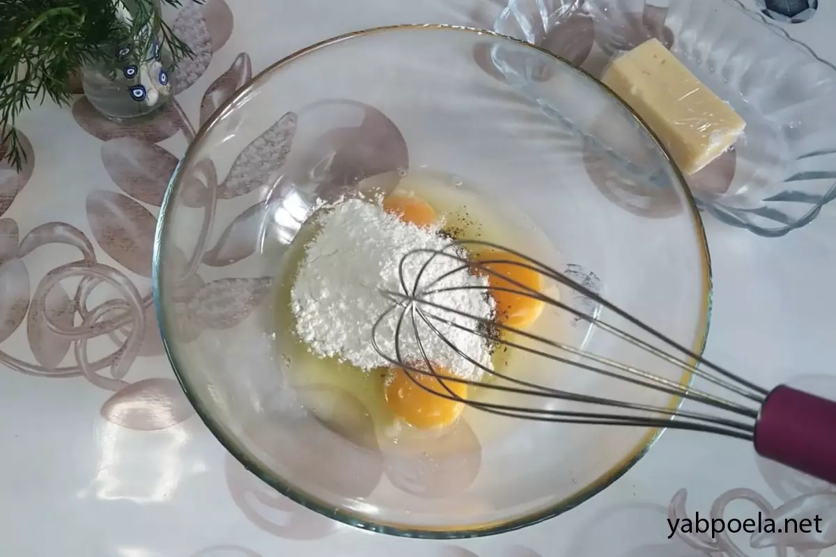 Додайте до яєць зі спеціями 2 ст. л. борошна. Ретельно все перемішайте вінчиком або виделкою, щоб у суміші не залишилося жодної грудочки.