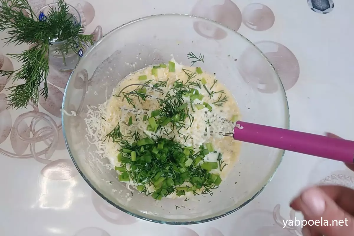 Сир (50 г) натріть на тертці. Дрібно наріжте свіжий кріп і зелену цибулю. Відправте сир і зелень у яєчну суміш. Туди ж влийте 100 мл молока (і, за бажанням, додайте трохи подрібненого часнику). Добре перемішайте — ароматна заливка готова!