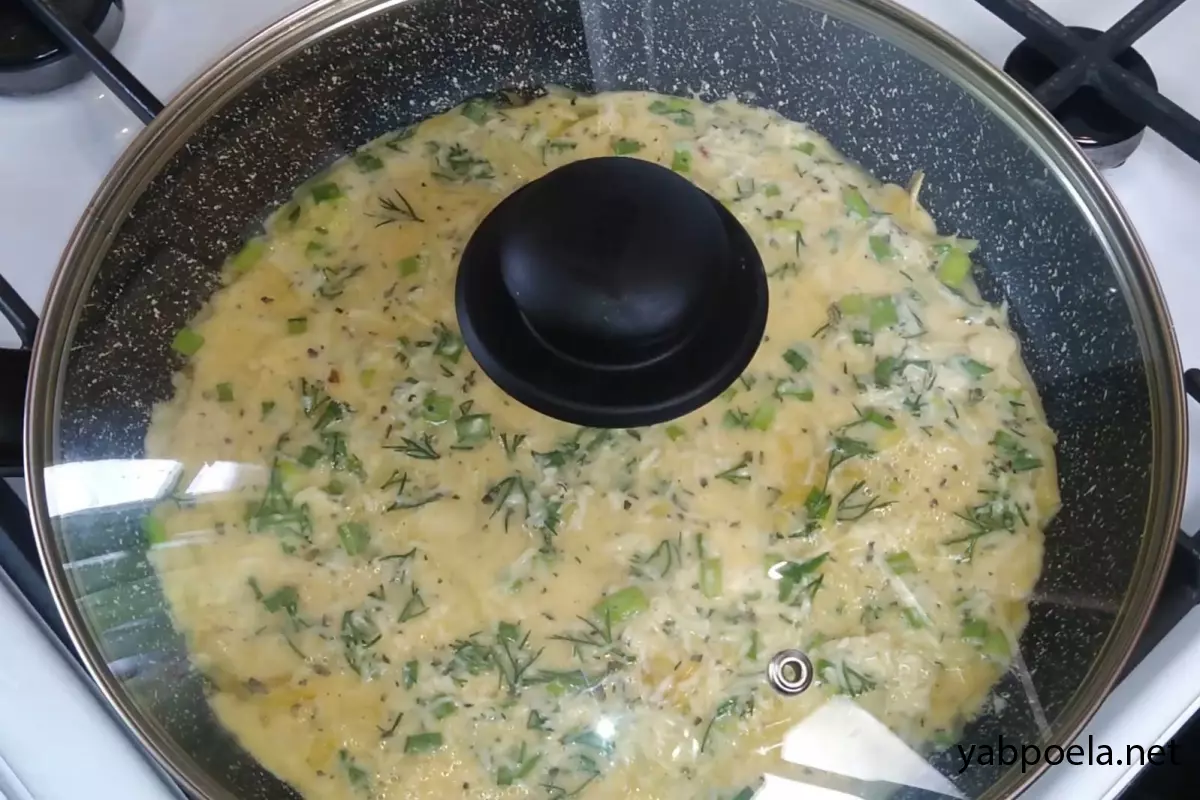 Накрийте сковороду кришкою і готуйте приблизно 4–5 хвилин. За цей час низ запіканки має добре схопитися та підрум’янитися.
