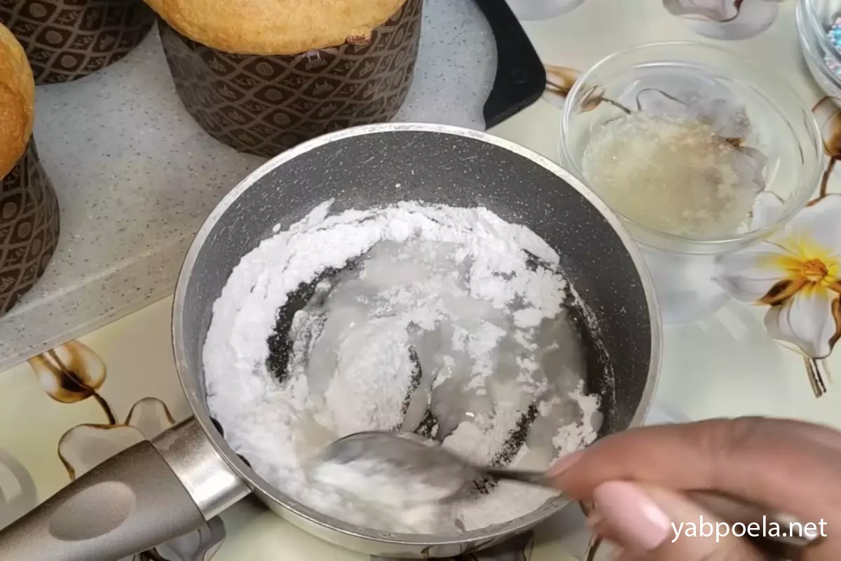 У сотейник або невелику каструлю насипте 100 г цукрової пудри і влийте 2 ст. л. води. Добре перемішайте, щоб пудра розчинилася.