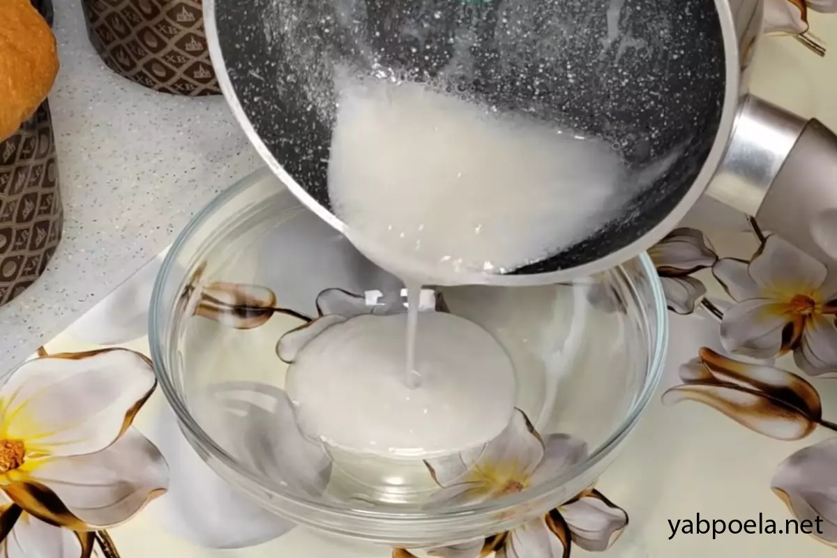 Одразу перелийте гарячий цукровий сироп у глибоку чашку або миску для збивання. Це потрібно для того, щоб температура сиропу трохи знизилася.