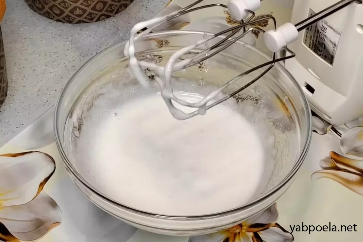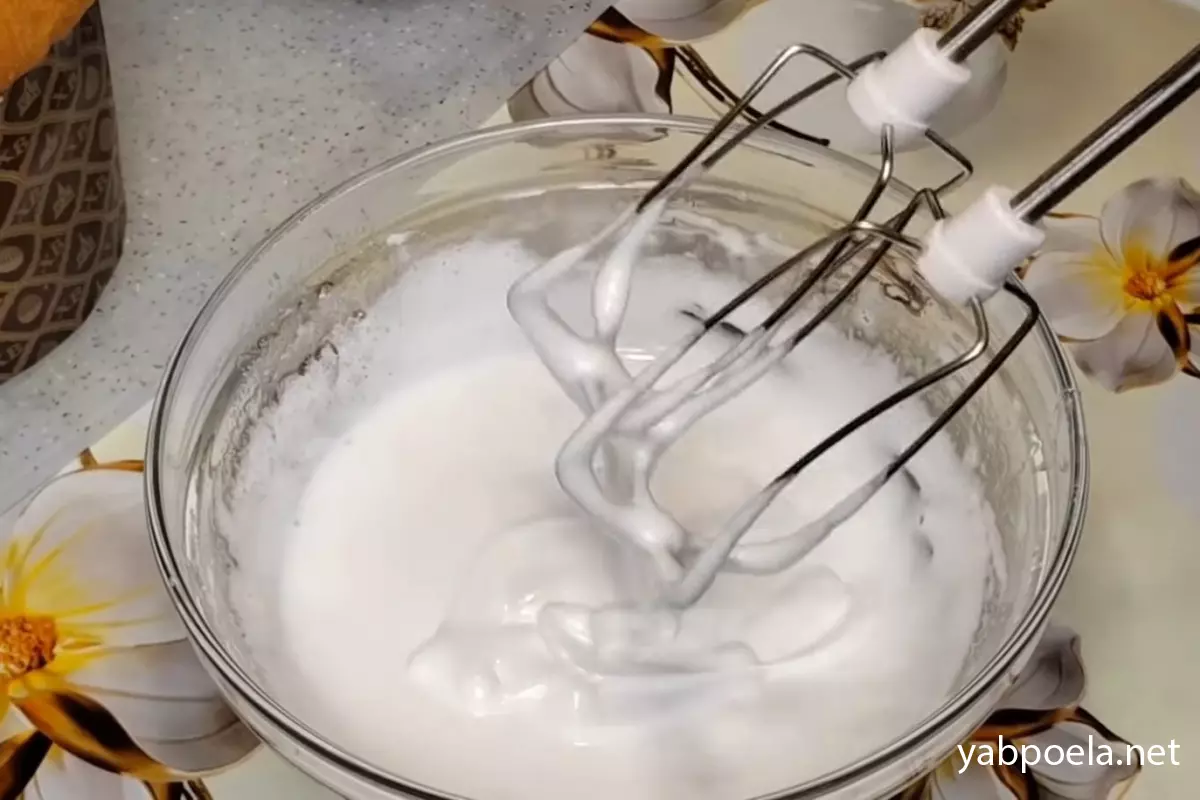 Візьміть міксер і одразу починайте збивати масу на високих обертах. Збивайте приблизно 30–40 секунд, поки маса не побіліє і не стане пишною.