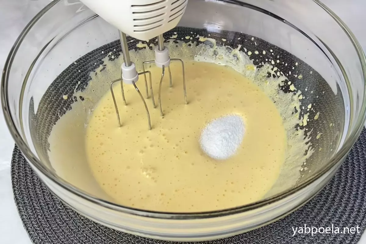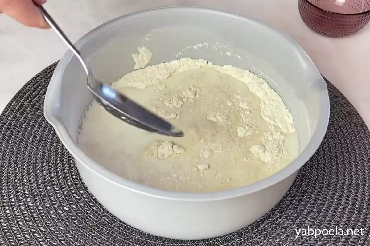 У зручну глибоку миску відсипте приблизно четверту частину борошна від загального об’єму. Додайте 14 г сухих дріжджів, 3–4 столові ложки цукру (із загальних 300 г) і злегка перемішайте сухі інгредієнти. Влийте 500 мл теплого молока (дуже важливо, щоб воно було не гарячіше 40 градусів, інакше дріжджі загинуть). Добре розмішайте — опара повинна вийти рідкої консистенції.