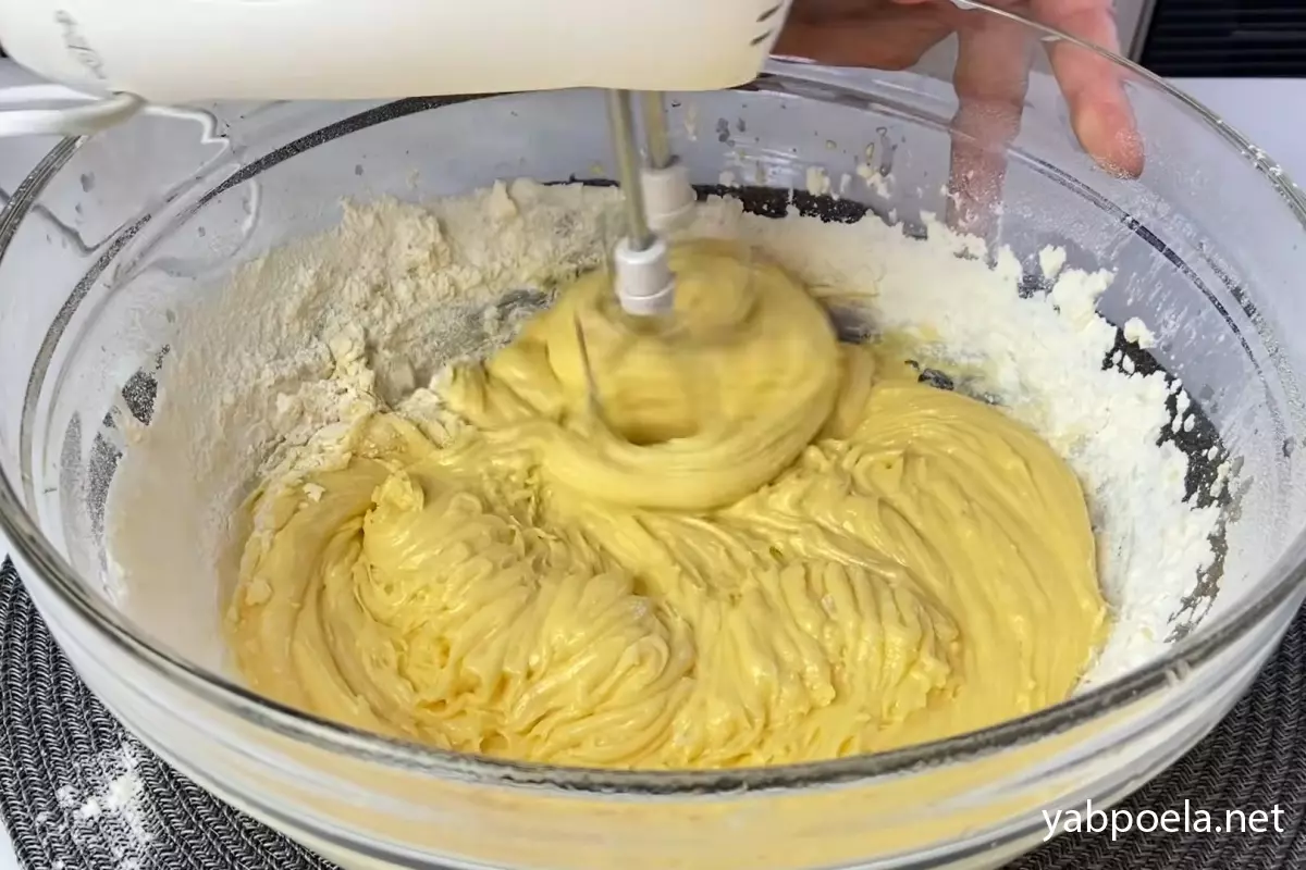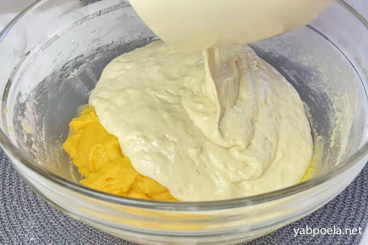 У жовткову масу влийте 300 г розтопленого вершкового масла (воно повинно бути теплим, але не гарячим!). Перемішайте міксером. Потім почніть поетапно вводити просіяне борошно, замішуючи тісто. Вологість борошна у всіх різна, тому у вас може піти від 800 г до 1 кг — орієнтуйтеся на м’яку, злегка в’язку текстуру.