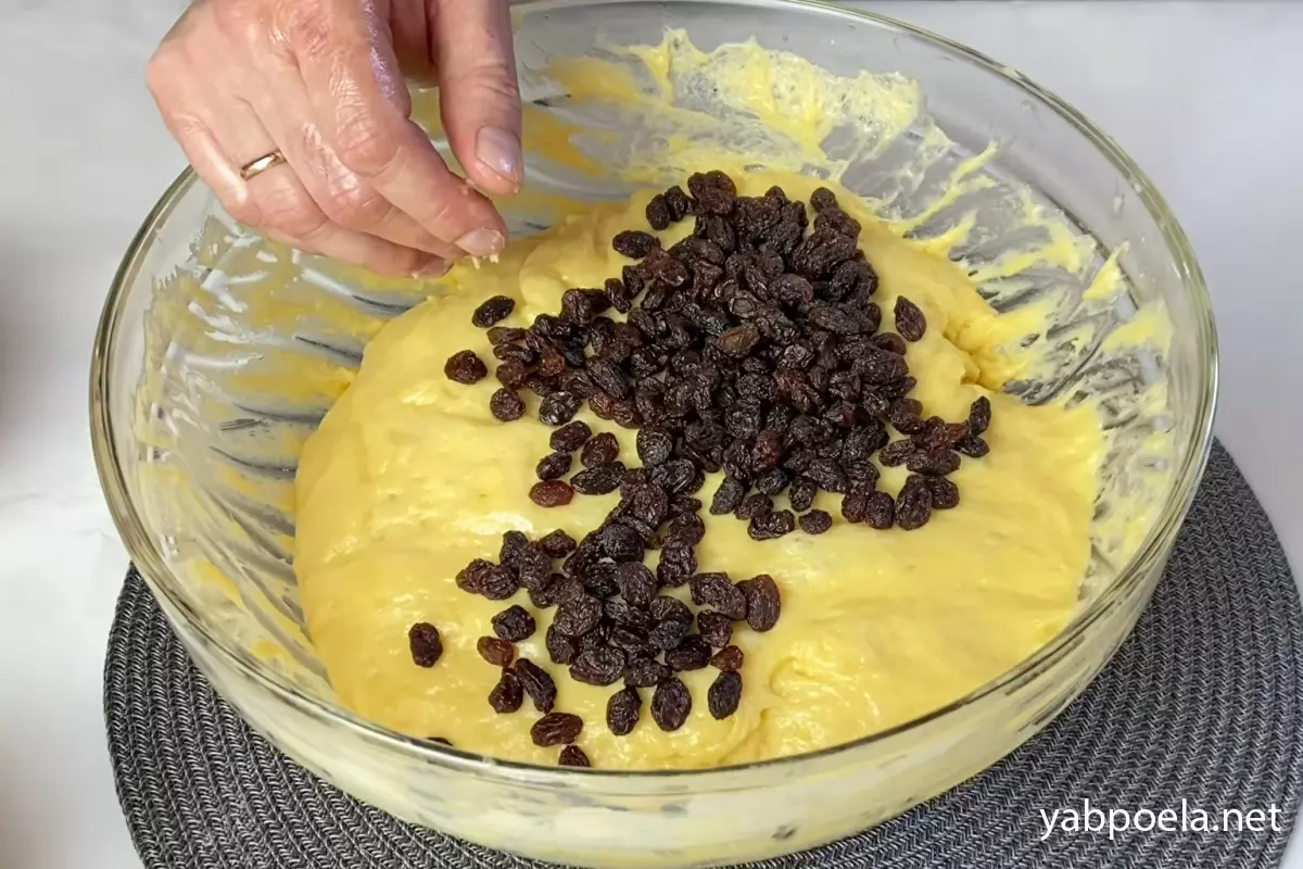 Важливо: якщо родзинки сухі й жорсткі, попередньо залийте їх окропом на 10 хвилин, а потім обов’язково обсушіть на паперовому рушнику.