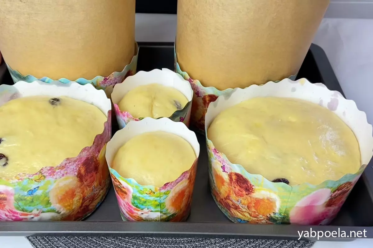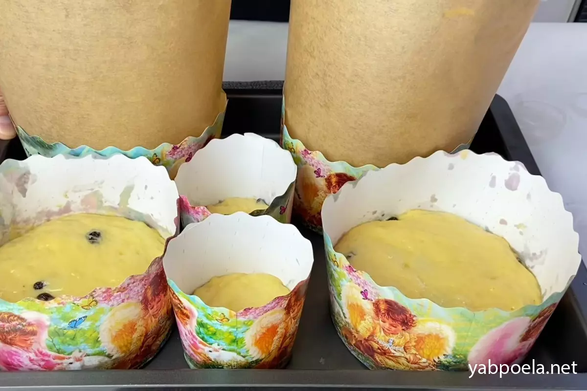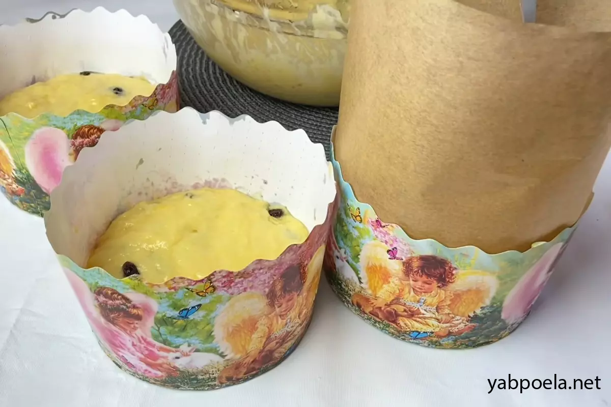 Оскільки тісто виходить неймовірно ніжним, рекомендую використовувати невеликі форми (максимум 10–13 см у діаметрі), щоб паски не осіли під власною вагою. Заповніть форми тістом рівно на 1/3 об’єму. Якщо хочете отримати високі паски, можна додатково наростити бортики форм пергаментним папером.
