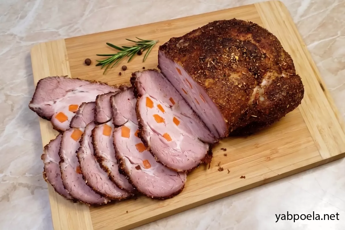 Це приголомшливий рецепт м’ясної нарізки, яка стане головною окрасою будь-якого святкового столу. Завдяки техніці низькотемпературного запікання свиняча шия виходить неймовірно соковитою, ніжною та зберігає всі м’ясні соки всередині, а яскраві вкраплення моркви роблять кожен шматочок у розрізі схожим на мозаїку. Це ідеальна домашня альтернатива покупній буженині та ковбасам!
