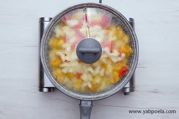 Все перемішайте, додайте третину склянки гарячої води. Тушіть ще хвилин 5 під кришкою.