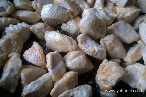 Обсмажуйте курку на добре розігрітій сковороді до легкої золотистості.