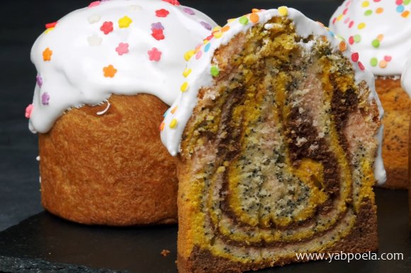 Оригінальна пасхальна паска різнокольорова всередині і з вкрапленнями маку - ефектна і дуже гарна випічка на Великдень. Проста паска без замісу тіста і відстою виходить дуже смачною, до того ж готується набагато швидше. Без штучних барвників! Апетний жовтий колір нам дасть куркума, коричневий колір - какао, а ніжно-рожевий ми отримаємо завдяки сухому вишневому киселю. Отже, перевірений рецепт, за яким ми приготуємо приголомшливу кольорову паску.