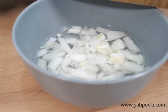 У невеликій мисочці змішайте оцет, цукор, сіль та окріп. Перемішайте ложечкою, щоб цукор та сіль розчинилися. Помістіть туди нарізану цибулю. Поки ви готуватимете інші інгредієнти, нехай він там маринується.