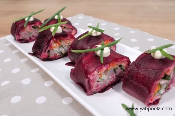 Потім розгорніть рулет. Він гарно виглядає і на ньому немає жодних прогалин, а все тому, що ми буряк накладали шматочками внахлест один на одного.